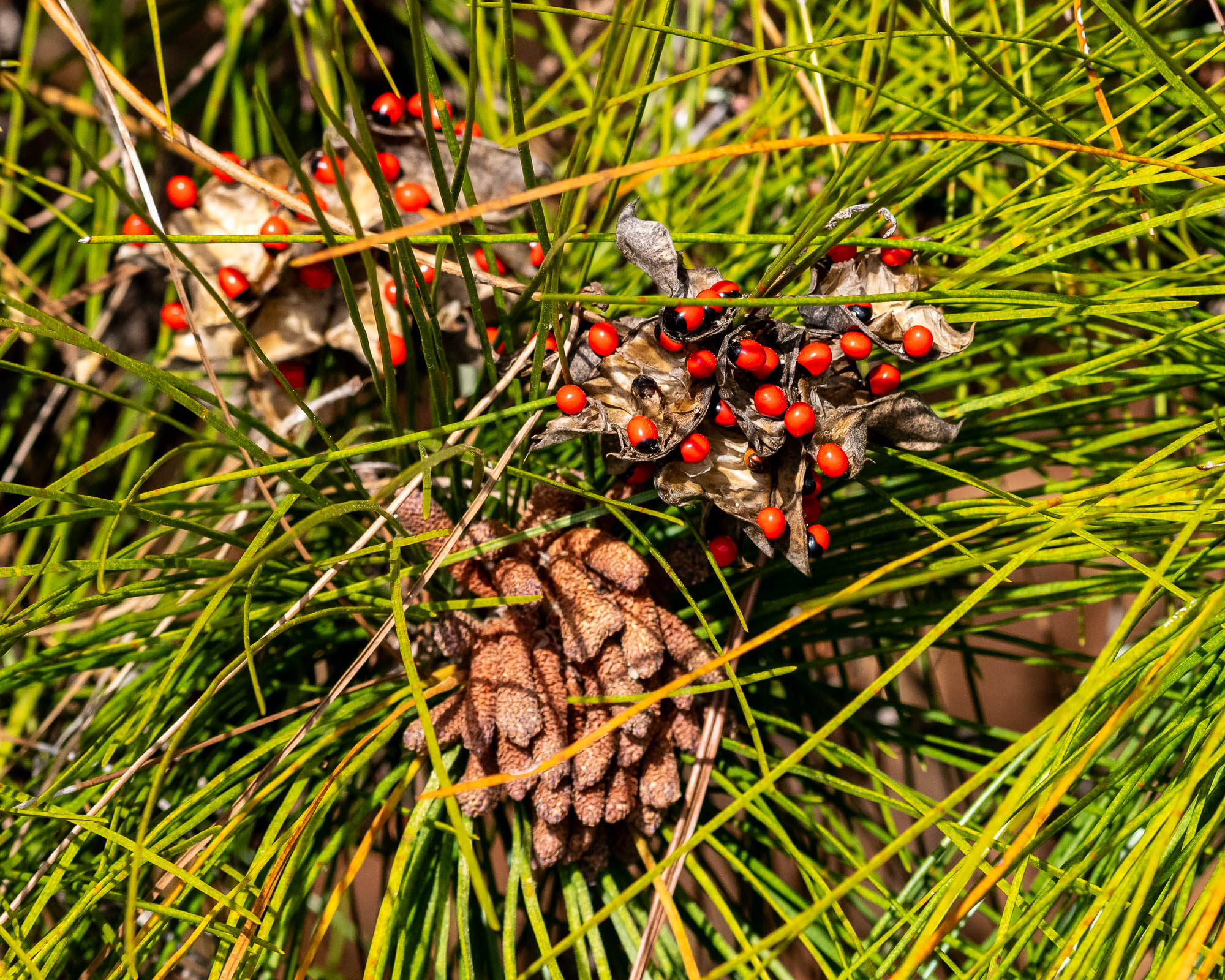 Lovely to look at, especially with bright green pine needles as a backdrop, the Rosary Pea (Abrus precatorius) has bright red seeds in a brown pod. Pretty lavender flowers will begin blooming in a few weeks. Caution. Those shiny seeds contain the deadly toxin abrin and can be fatal if swallowed. This is a non-native plant from India/Asia.
