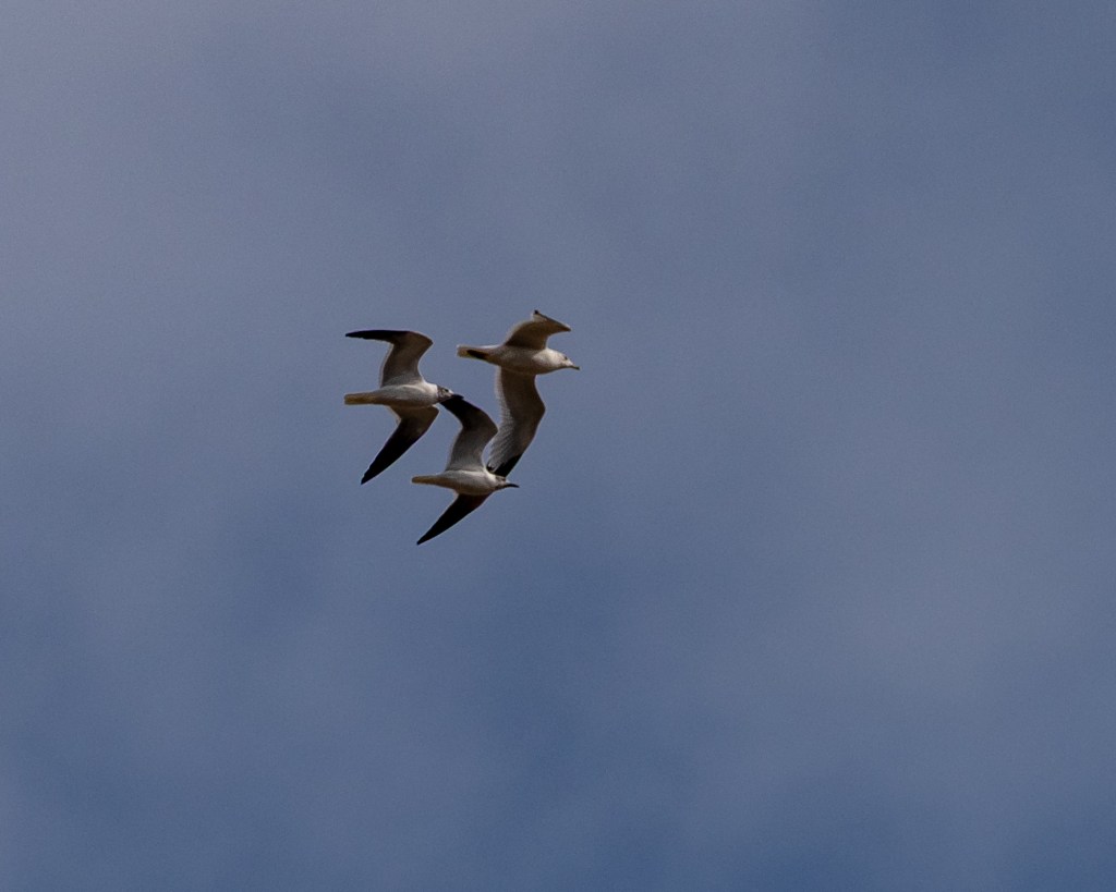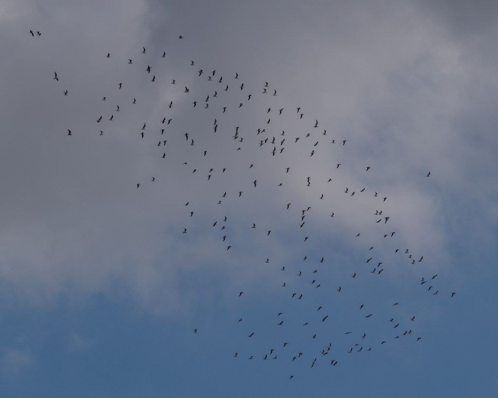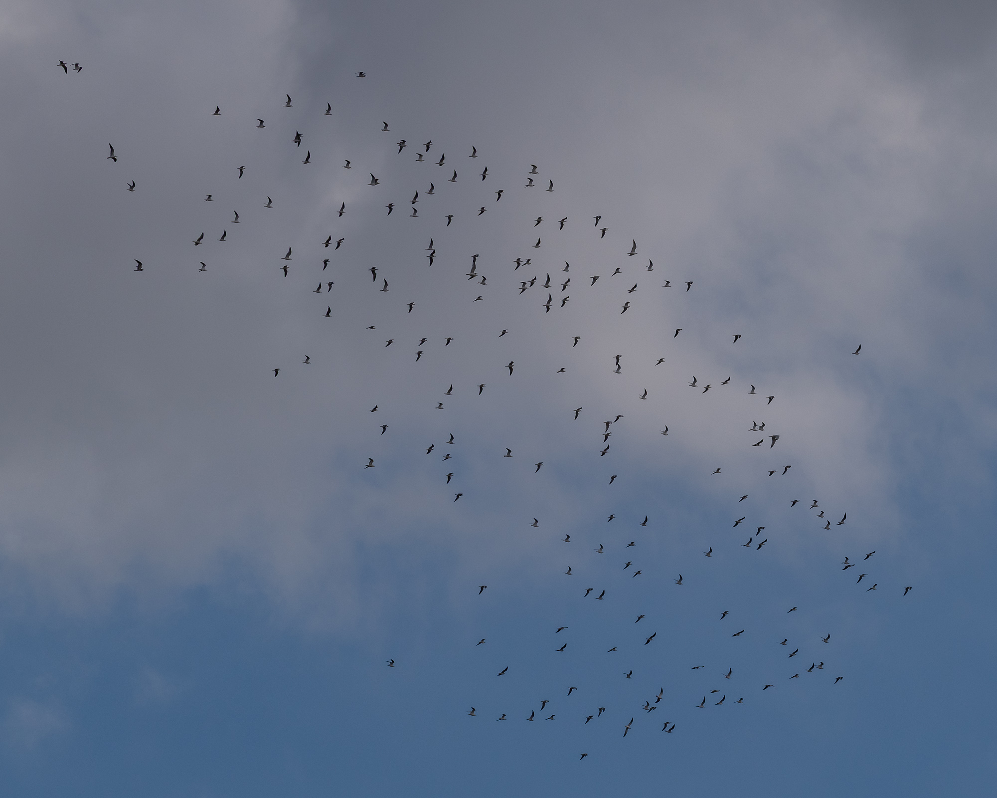 “Look straight up!” I was getting out of the car to chase a warbler, but her shout revealed a huge flock of birds high overhead. From several photos I estimate there were 220-250 Laughing Gulls in the group. There was a mix of mature/immature birds in breeding and non-breeding plumage. Never seen a flock of gulls that large.