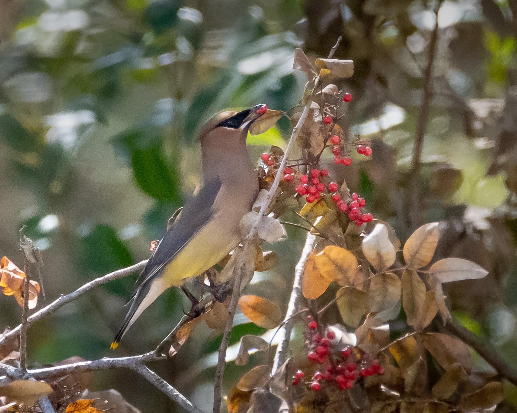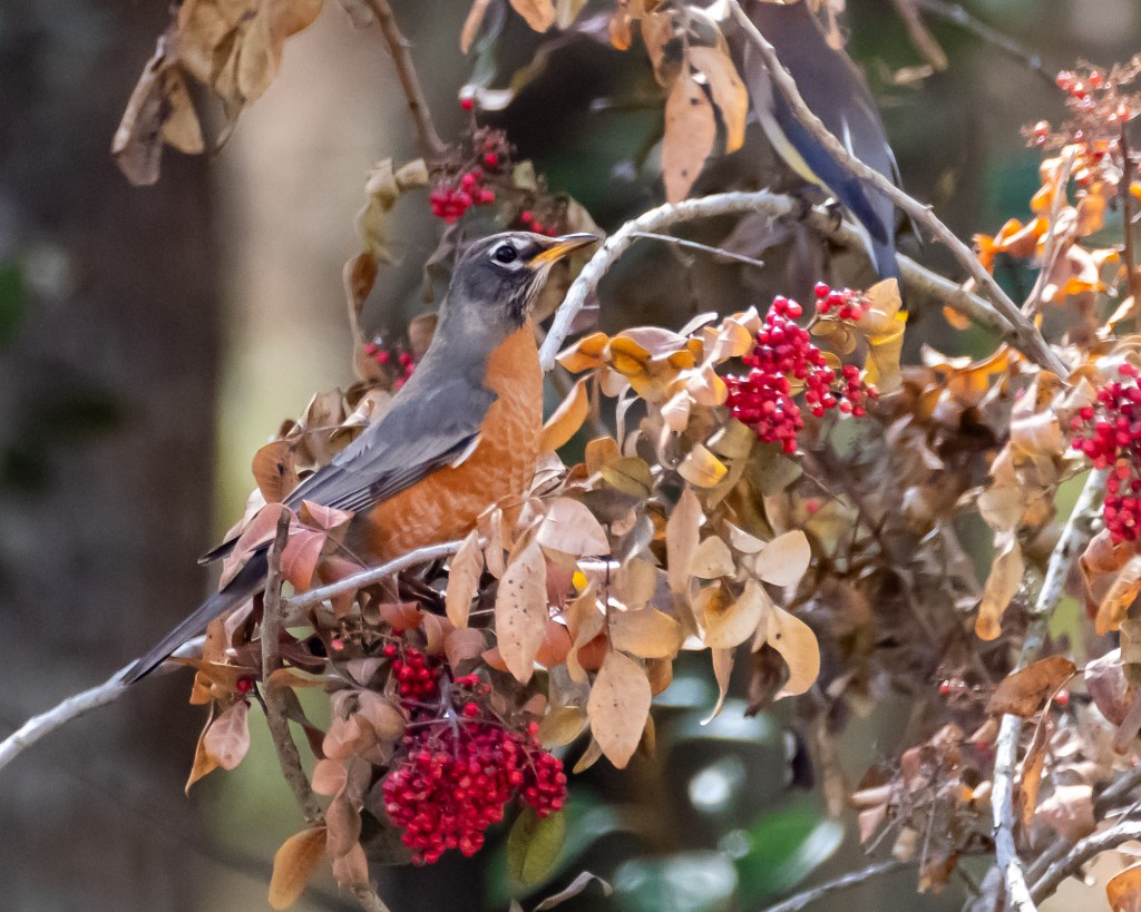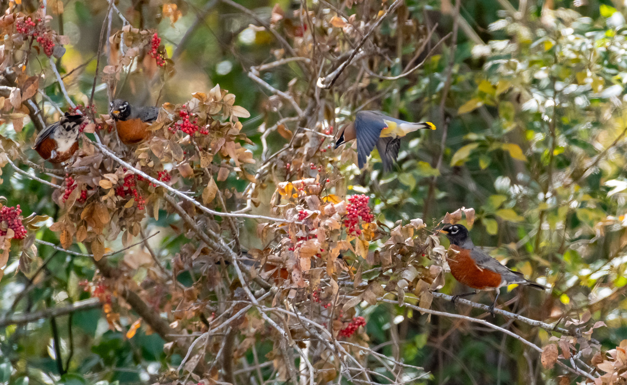 Another very invasive plant, the Brazilian Pepper (Schinus terebinthifolia) is a native of South America and displaces native species if allowed to thrive. It is very difficult to eradicate. One reason it’s so hard to control is those darned birds love the juicy red fruit and spread the digested seeds far and wide. Although we were happy to find a group of American Robins and Cedar Waxwings busily consuming the energy-rich berries, we wished there were native plants for them to visit instead.