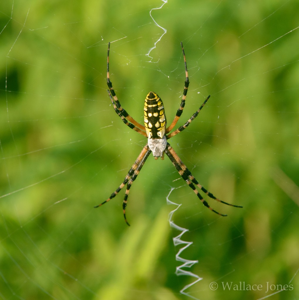 Some spider species can be recognized by their webs. The zig-zag “zipper” in the center of this large web identifies the owner as the beautiful Black and Yellow Argiope (Argiope aurantia).