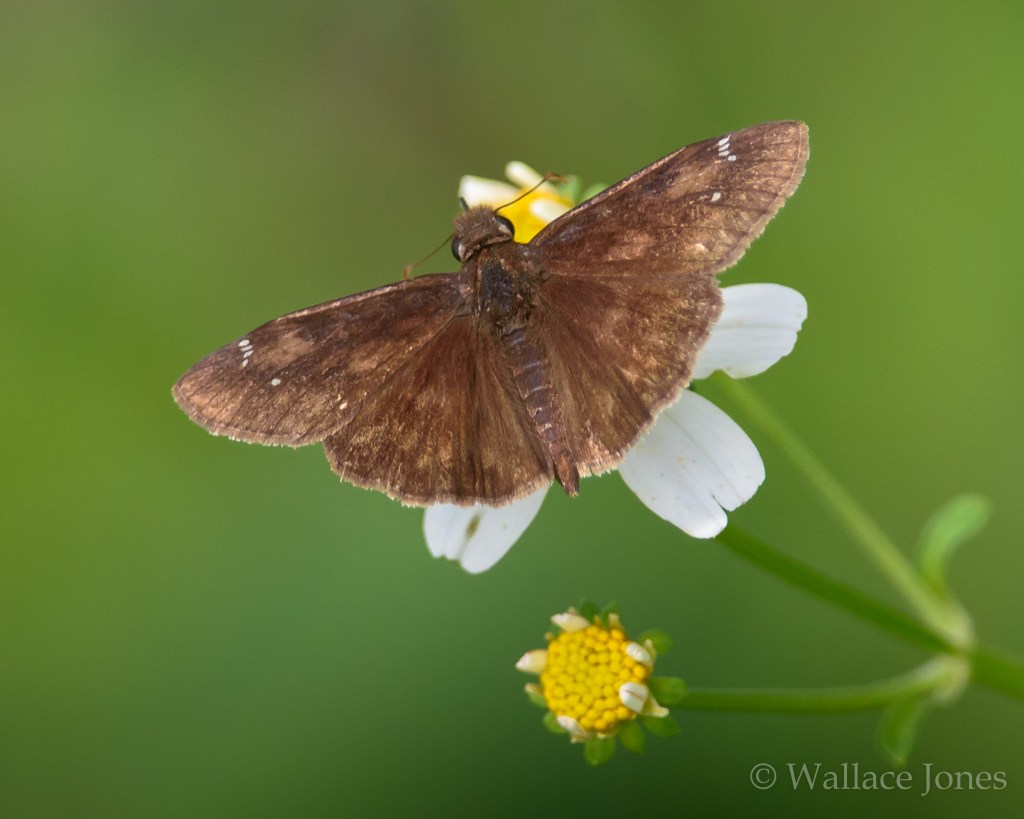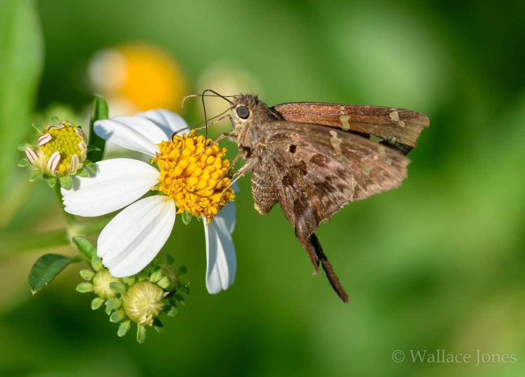 Skippers get their name from how they appear to “skip” in flight from one flower to another. Worldwide, there are more than 3,000 species of skippers! We took a picture of just a few today. A Dorantes Longtail (Urbanus dorantes) has twin “tails” for which it is named. The left “tail” has been removed, likely by a predator.