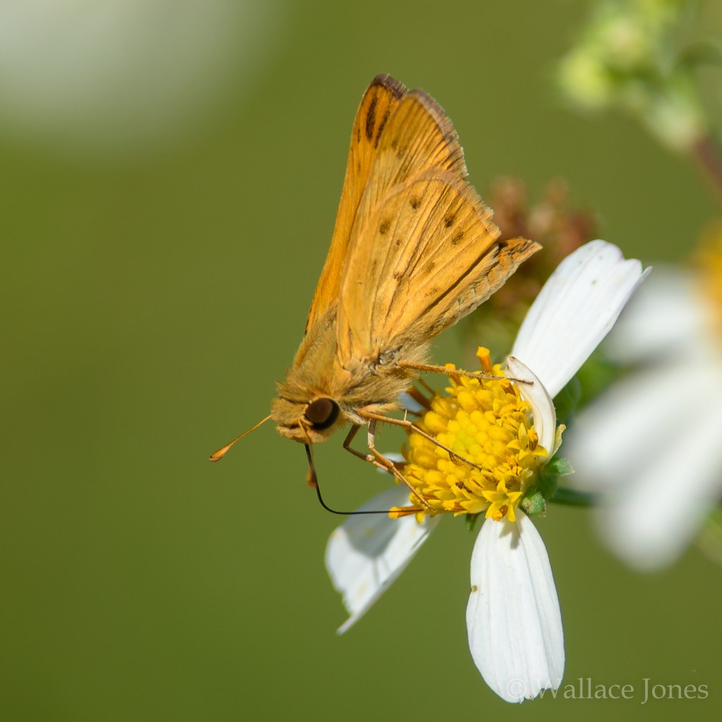 One of the smaller members of the vast skipper family of butterflies, the Fiery Skipper (Hylephila phyleus) can be identified by the small scattered spots on its hindwing.