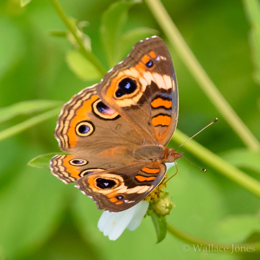 Eyes on its wings. The large spots on the wings of a Common Buckeye (Junonia coenia) could be mistaken by a would-be predator for eyes and will sometimes result in the butterfly escaping rather than being eaten. Not too bad to look at, either!