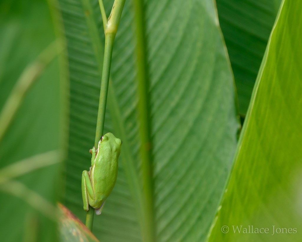 In the wetlands, a small Green Tree Frog (Hyla cinerea) tries to make herself look even smaller as she clings to a stem of Alligatorflag (Thalia geniculata).