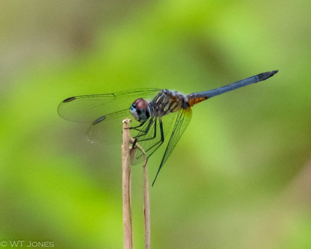 Small and quick, the Blue Dasher (Pachydiplax longipennis) perches with wings forward ready to chase down any passing morsel.