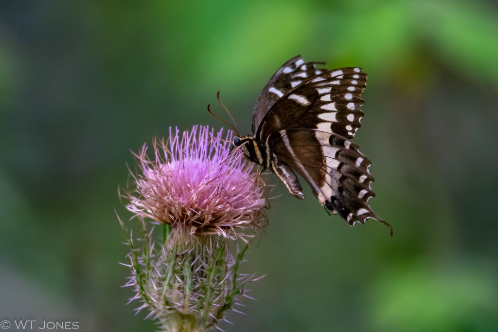 One of our larger butterflies, a Palamedes Swallowtail (Papilio palamedes) braves the prickly leaves to obtain the sweet nectar of a Purple Thistle (Cirsium horridulum).