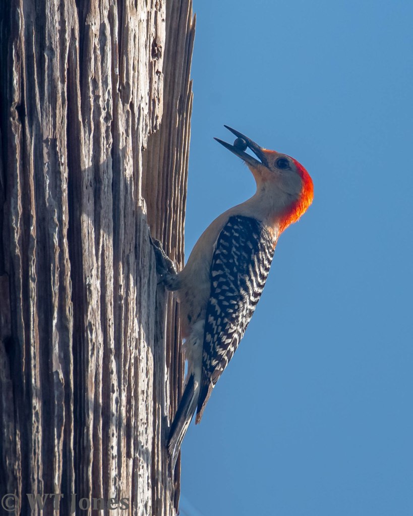 The Red-bellied Woodpecker, like many woodpecker species, will cache food as the year progresses. Here, a male tucked an acorn into a crevice of a utility pole.