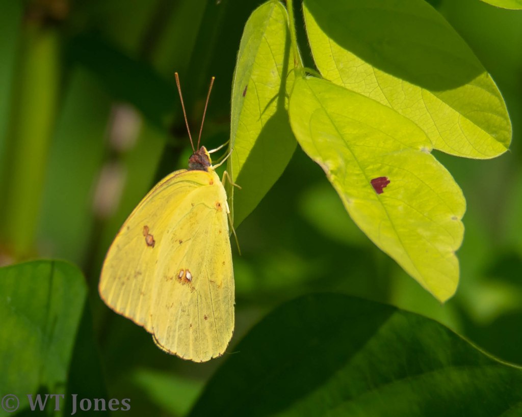 The Cloudless Sulphur (Phoebis sennae) is one of the largest sulphurs in our area. This is a female. The male has less conspicuous wing markings.