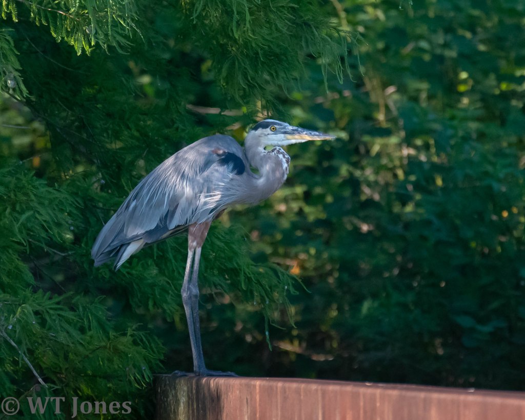 A foot bridge railing provides a nice spot for perching. The Great Blue Heron looks a bit out of place since we normally see them knee-deep in the water.