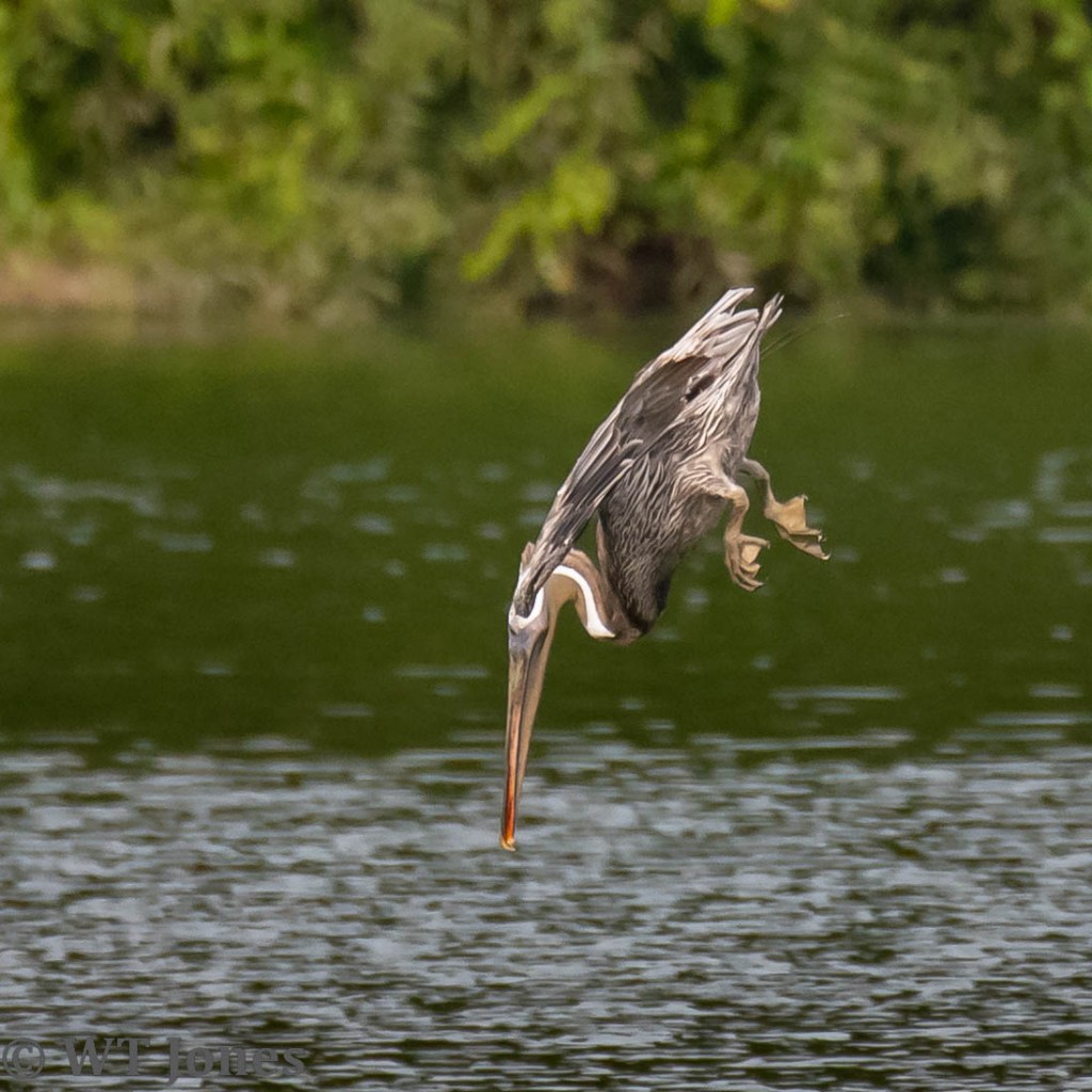 Pelicans are normally associated with salt water. We are about 50 miles from the nearest salt water but a small group of Brown Pelicans breed in our local lakes annually. This one spotted a school of small fish, made a dive and filled its pouch with breakfast.