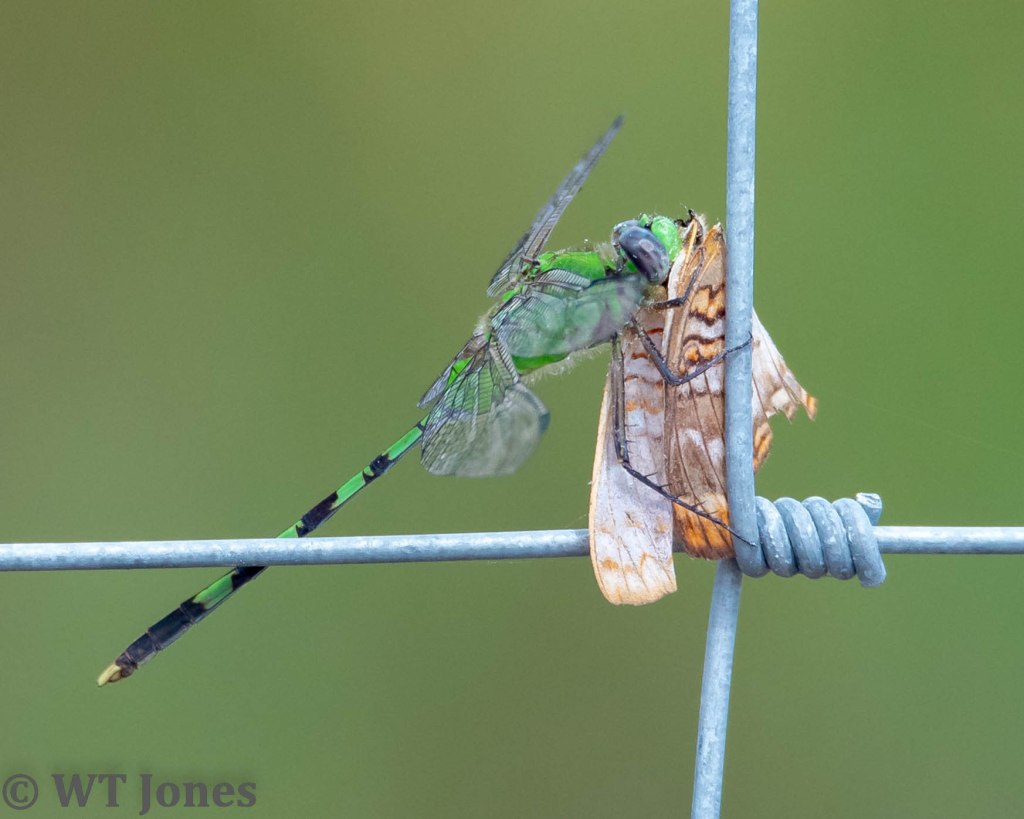 Its appearance is similar to the female Eastern Pondhawk (Erythemis simplicicollis), but the Great Pondhawk (Erythemis vesiculosa) is a bit larger, slimmer and both sexes are green. We have not seen very many of these dragons as opposed to the huge abundance of the Eastern Pondhawk. This individual is enjoying a healthy meal of White Peacock (Anartia jatrophae). Mmmm, butterfly, it’s what’s for dinner.