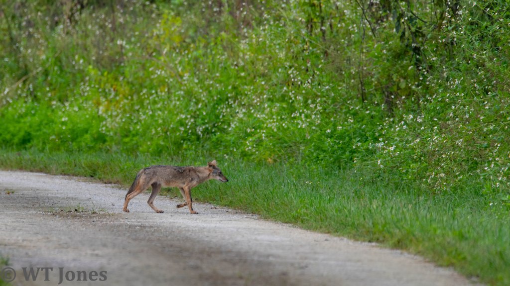 We had an early morning surprise when a Coyote sauntered across the road. Poor guy looked like he had a rough night. Coyotes are not uncommon in the area although we usually just see their tracks. Around sunrise, the earliest callers of the bird world are Northern Cardinals and Mourning Dove. As the night gives way to the new day, flocks of White Ibises and Cattle Egret move from roosts to feeding areas. Hammering of woodpeckers can be heard throughout the forest. Common Gallinules gabble from all the lakes. A Red-shouldered Hawk’s scream ensures any creature still asleep is now fully awake.