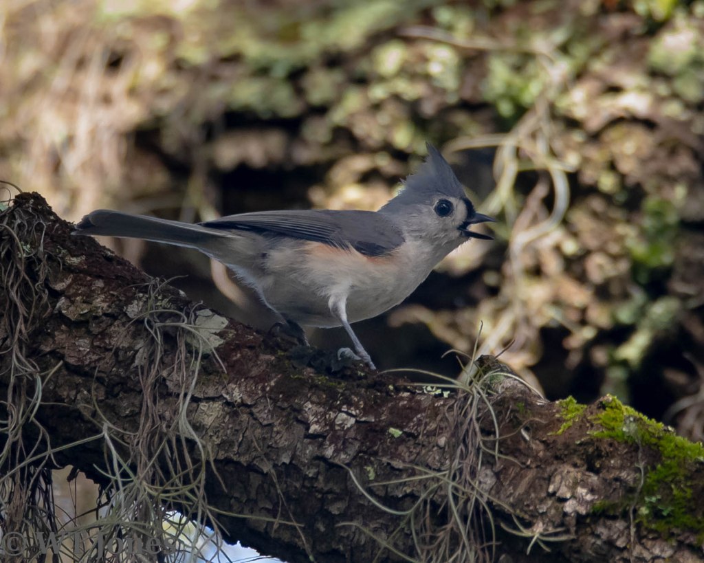 Migratory gang leader. Small songbirds tend to flock together as they migrate each year which may be a strategy for protection from predators. The Tufted Titmouse is typically the first to show up and yell at us as the other gang members flutter around, join in the yelling and eventually flee to the upper canopy.