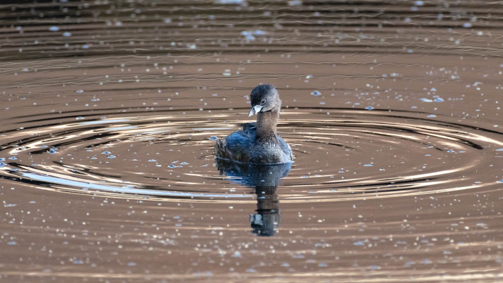 A Pied-billed Grebe bobbed up from a dive and created a nice circle of ripples in the warm glow of the morning sun.