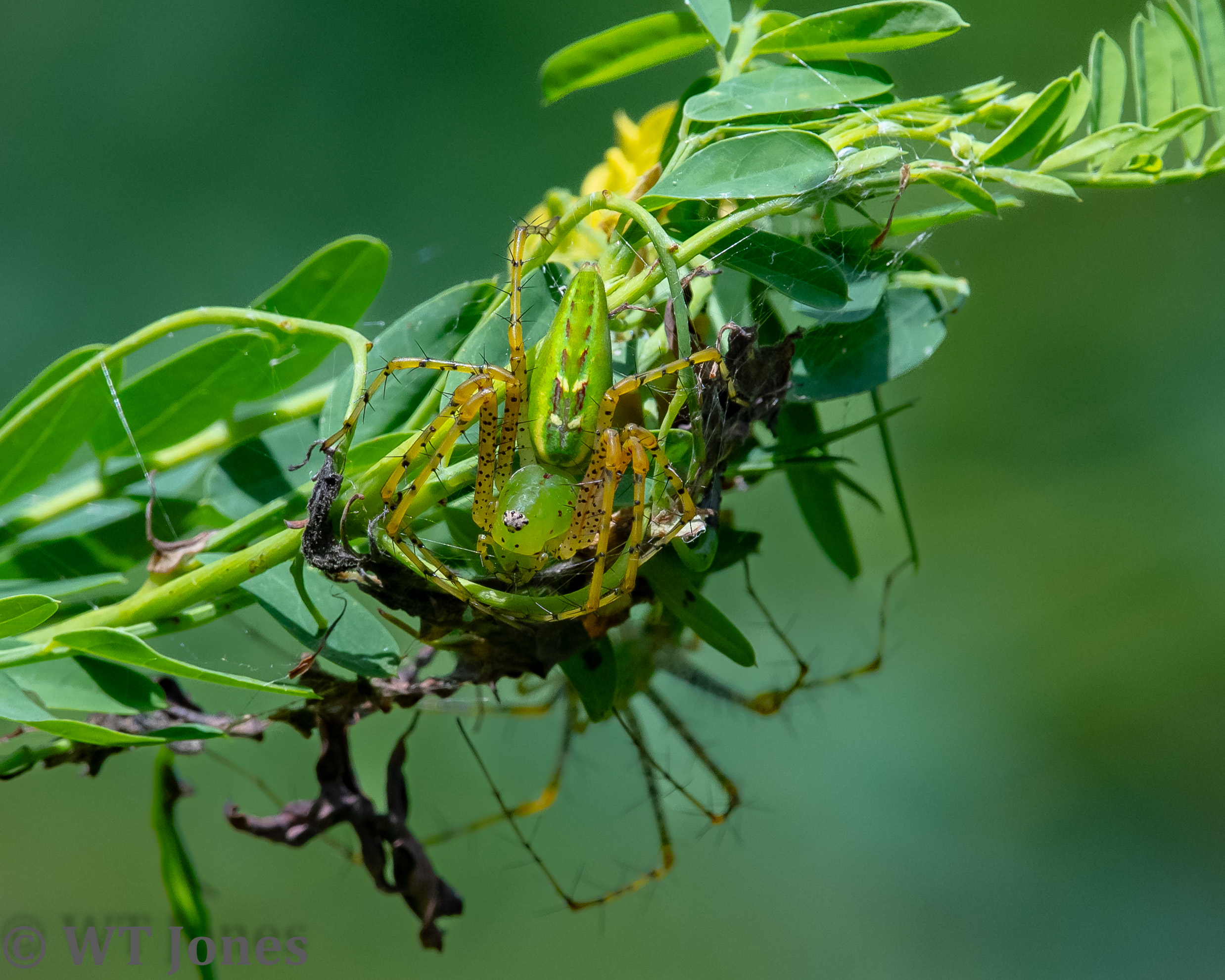 The Green Lynx is more active in September and October as that’s when they produce an egg sac. Typically, there will be 200-400 eggs and while they are in the sac, Mama will aggressively attack anything which comes too close.