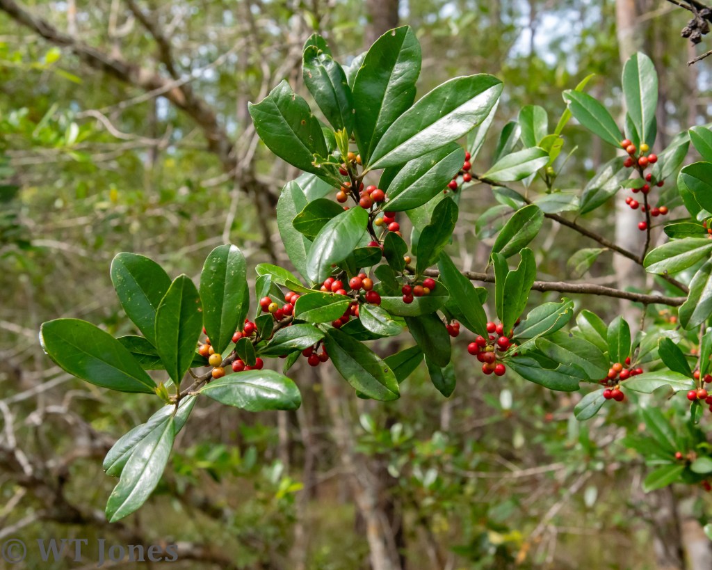 Here and there were small bright red lights shining among the deep green pines. This one is theYaupon Holly (Ilex vomitoria).