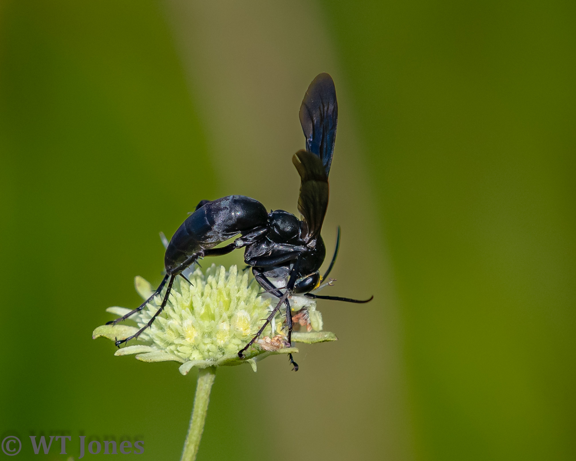 (Updated from original post.) An entomologist has informed me this is a Spider Wasp in the family Pompilidae. We saw several today which were very actively pursuing nectar, mostly among the Clustered Bushmint (Hyptis alata). Or, perhaps they were searching for spiders?