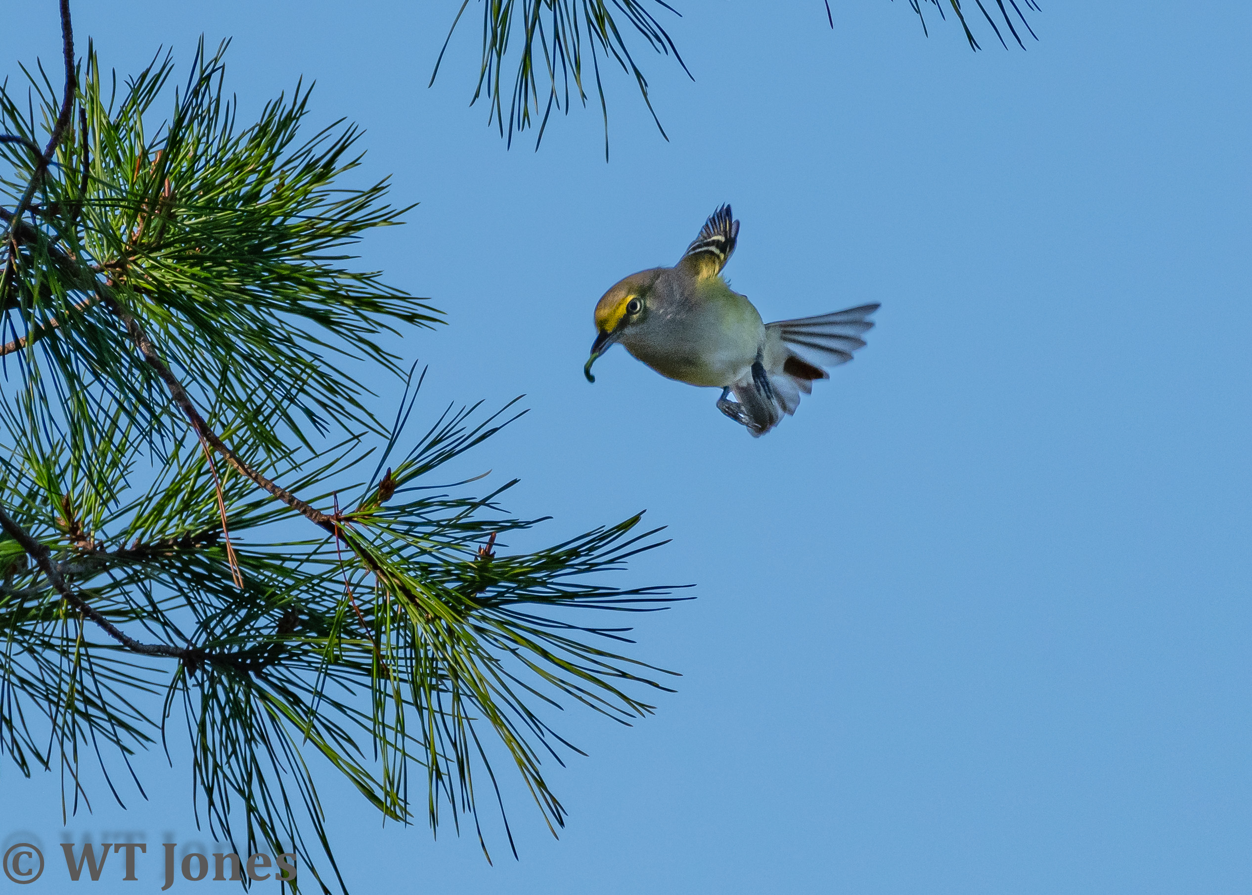 A White-eyed Vireo takes time out from singing to snag a bug.