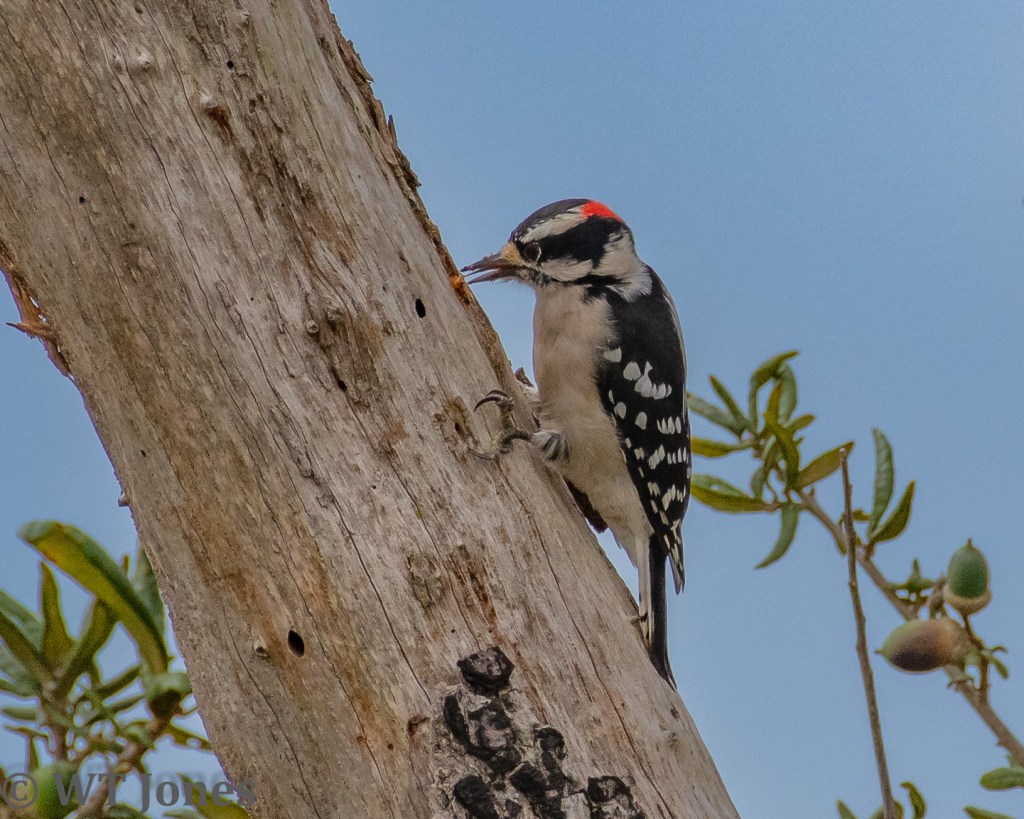 A male Downy Woodpecker found something he liked in the crack of a dead snag. His sticky tongue darted in and out as he gobbled up whatever was in there.