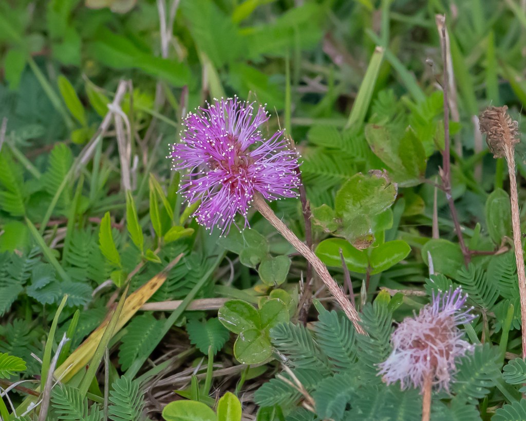 We like saying the name as much as we like looking at the flower. Sunshine Mimosa (Mimosa strigillosa). Also called Powderpuff, this beauty is much better behaved than its relative, Sensitive Briar (Mimosa quadrivalvis), which has stems covered in nasty thorns.