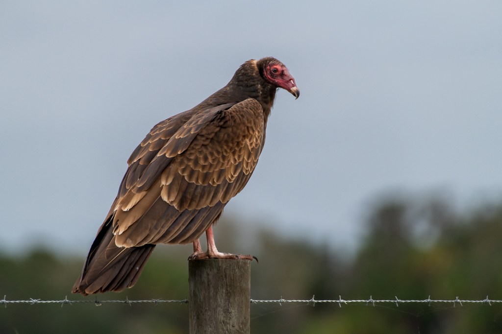 When circling high overhead, Turkey Vultures appear almost all black. Up close, it’s surprising how much brown plumage they have. I think this is a young adult, based on the diffused red on its head and dark bill tip.