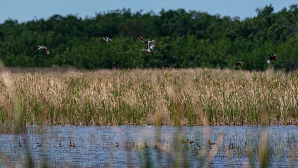 Throughout the preserve are small areas of open water. If you’re a duck, you know where to find these waterfowl oases. These are all Blue-winged Teal.