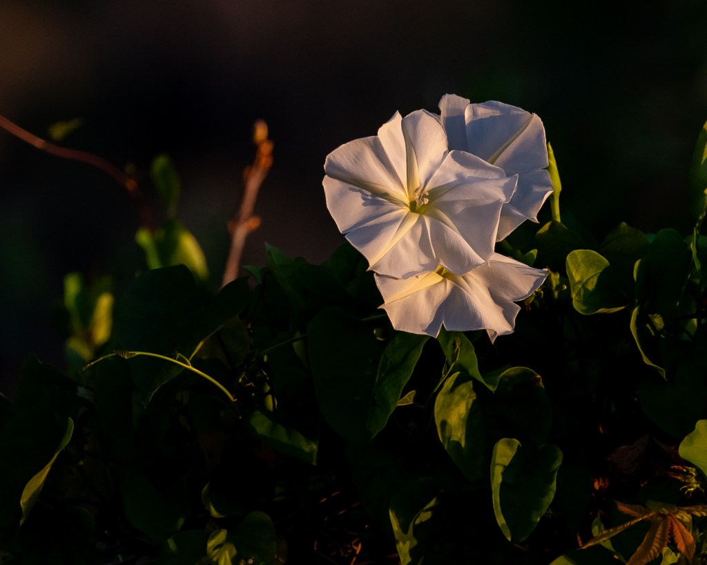 After snapping a few images of the morning sky, I turned around to discover two large bushes covered in blooms. The Moonflowers (Ipomoea alba) were illuminated by the sun’s rays and the big morning glory blossoms seemed even more incredible than usual.