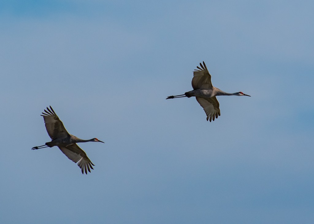 Trumpeting of a pair of Sandhill Cranes grew louder and they eventually landed in a nearby field. Although several thousand migratory cranes visit Florida each year, these are likely a resident sub-species which breed in the state.