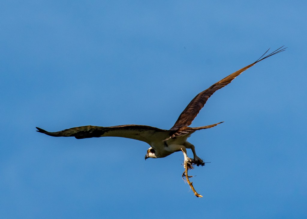 The Osprey had just landed atop that pole with his stick and I was close enough that the combination of clicking camera and me moving around put them on alert. I apologized and retreated. Will soon check on their progress.