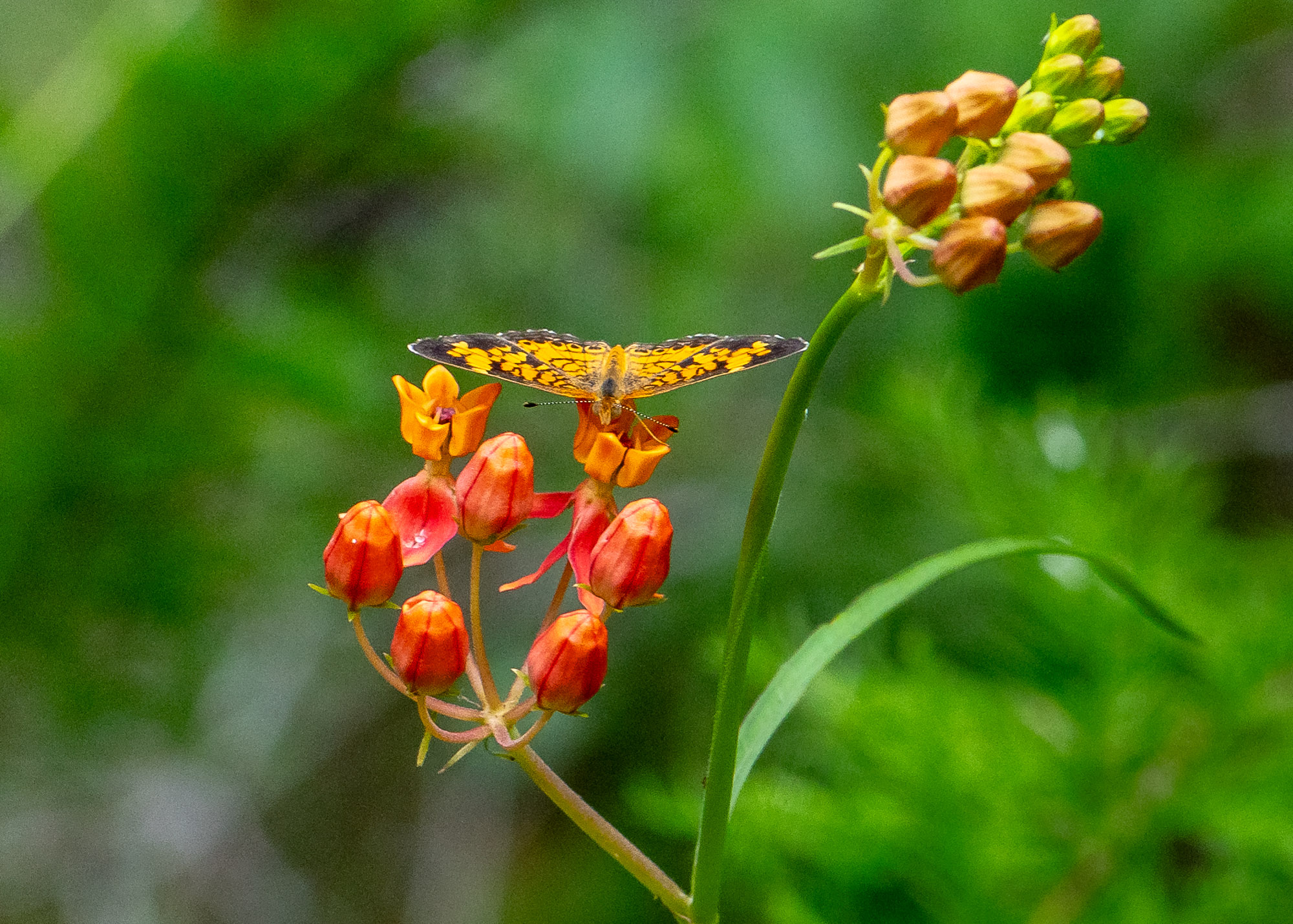 Bright orange flowers and narrow leaves help identify the Fewflower Milkweed (Asclepias lanceolata). Several species of Milkweed are larval hosts for Monarch, Queen and Soldier butterflies. More than a few others like its tasty nectar just fine. Oh, here’s one now – a thirsty Pearl Crescent (Phyciodes tharos).
