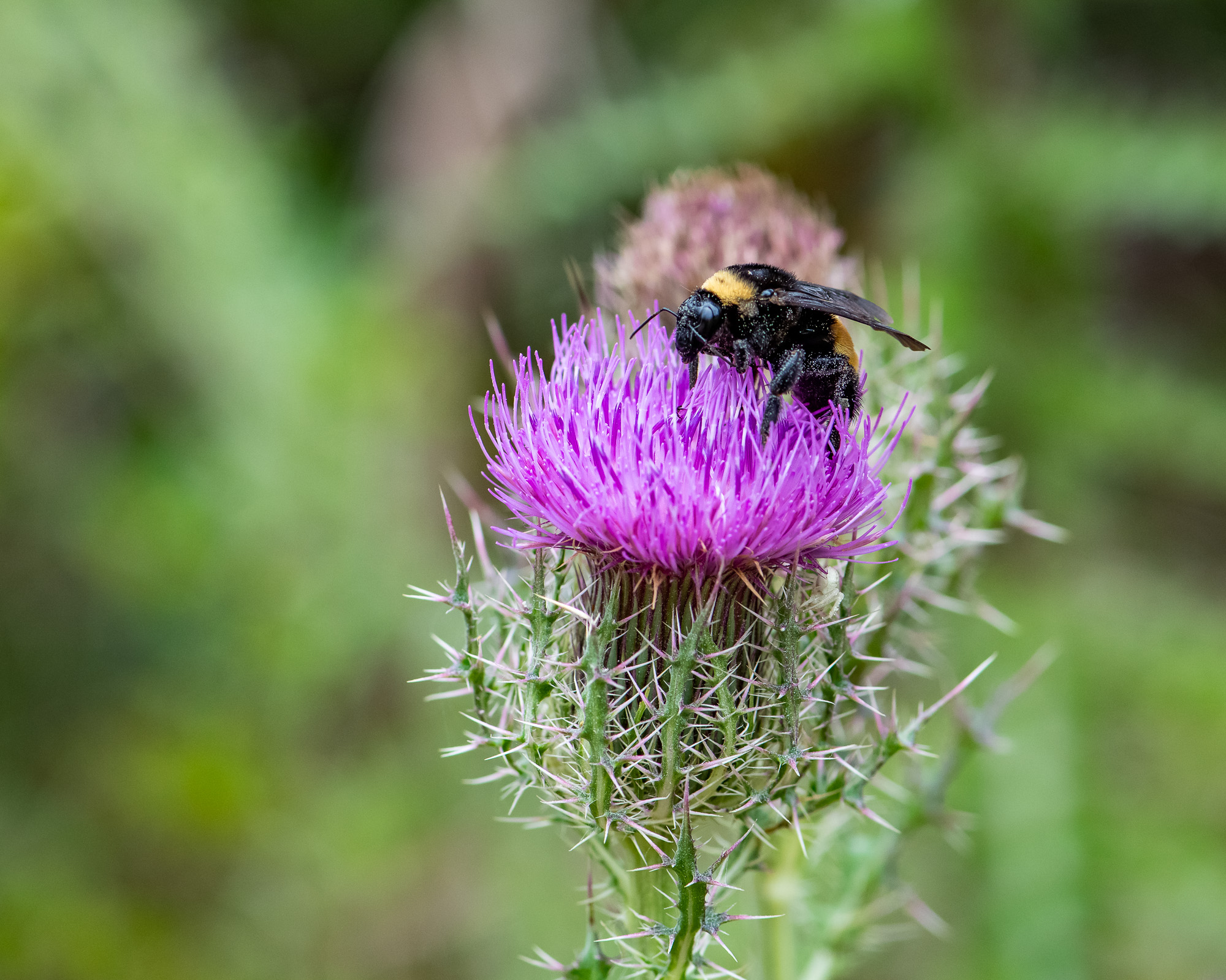 One of our favorite critters to encounter in spring and summer is the Hummingbird Clearwing (Hemaris thysbe). This moth is a bit larger than a Bumble Bee and loves those thistles we just mentioned.