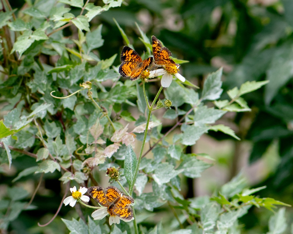 Several Pearl Crescent (Phyciodes tharos) butterflies flitted just outside the car window.