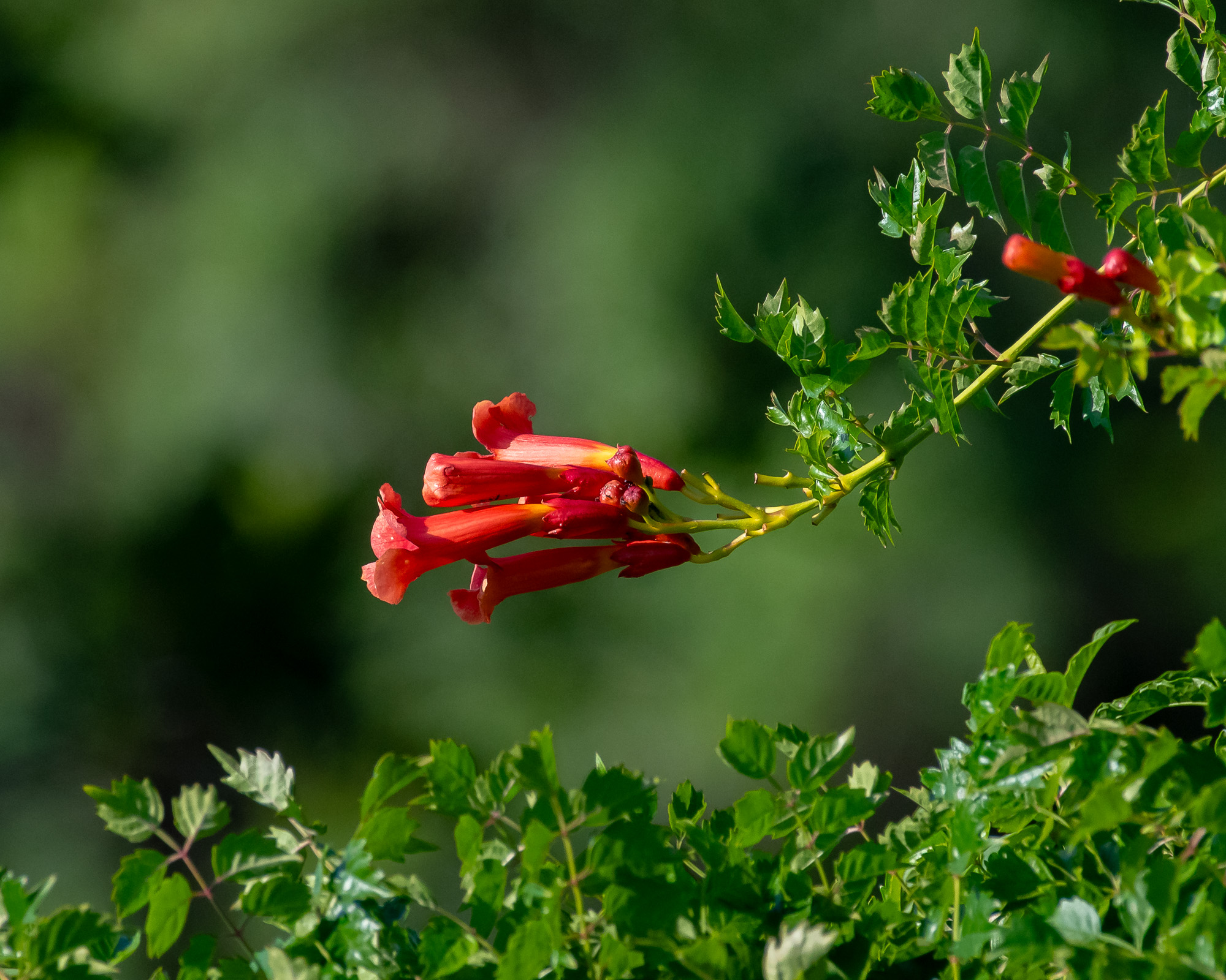 Trumpet Creeper (Campsis radicans) loves to climb. It’s been known to reach 30 feet and more as it wraps around tall tree limbs. Hummingbirds love the nectar of these blooms. Alas, not today.
