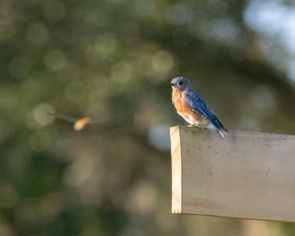 As we focused on the Eastern Bluebird, it was focusing on a photo-bombing dragonfly.