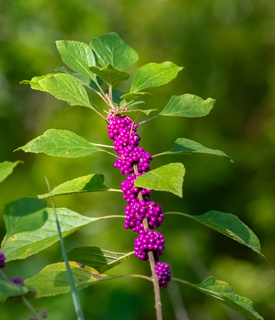 Part of our “autumn color” is the bright American Beautyberry (Callicarpa americana). We have read that the berries can be made into jelly and that the leaves, when crushed and rubbed on the skin, may repel biting insects. Verify these things BEFORE you decide to try them!