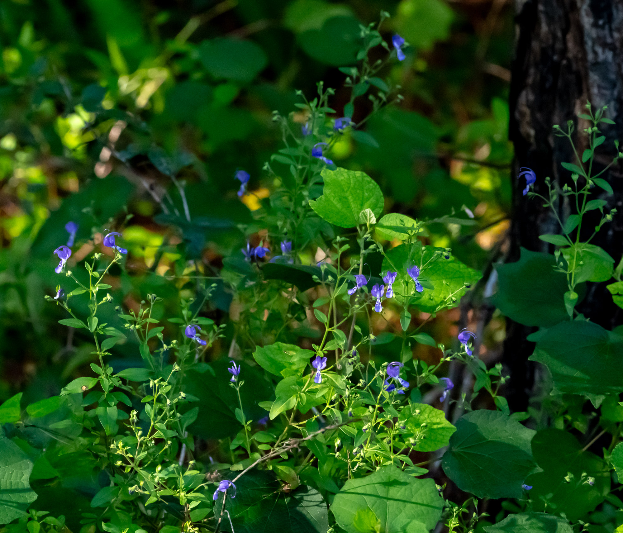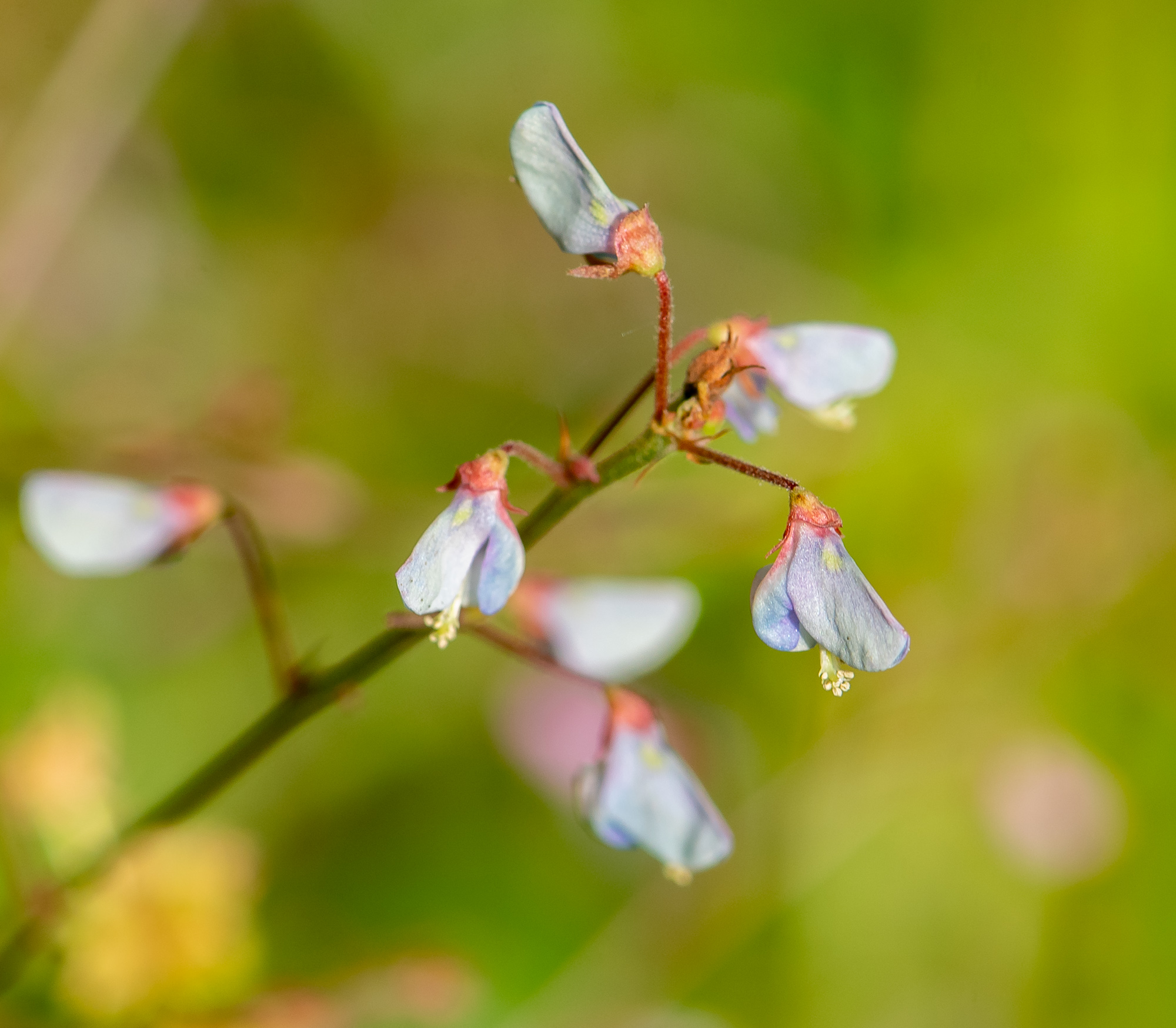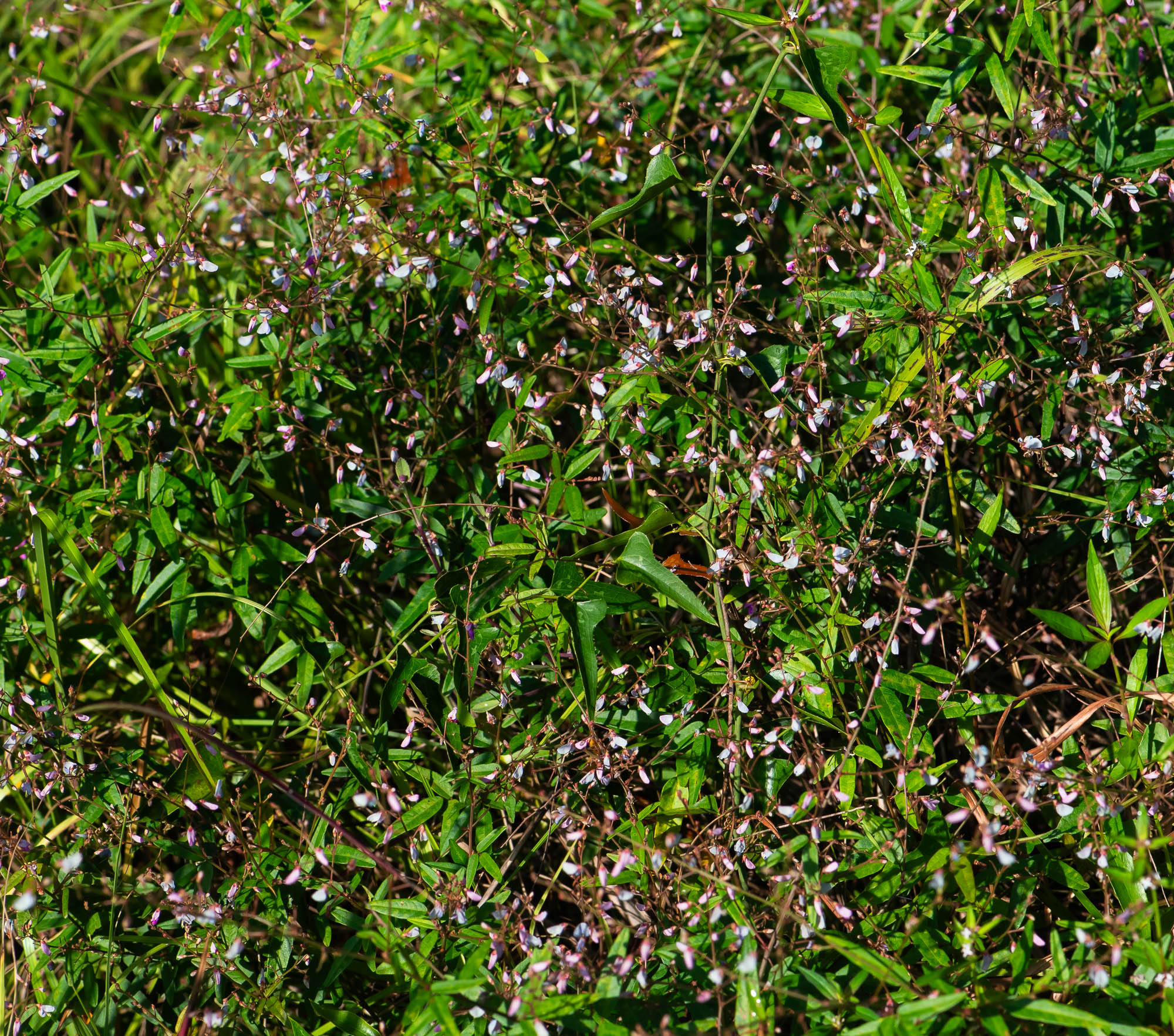 Panicled Ticktrefoil (Desmodium paniculatum). Long name for a very small flower. It forms fairly dense undergrowth which is fun to slog through. We grew up calling it “beggarlice”. Some call it “velcro plant”. The seeds love to stick to your clothing which provides endless hours of fun when you return home and she says you have to remove all those things before tossing your pants into the laundry.