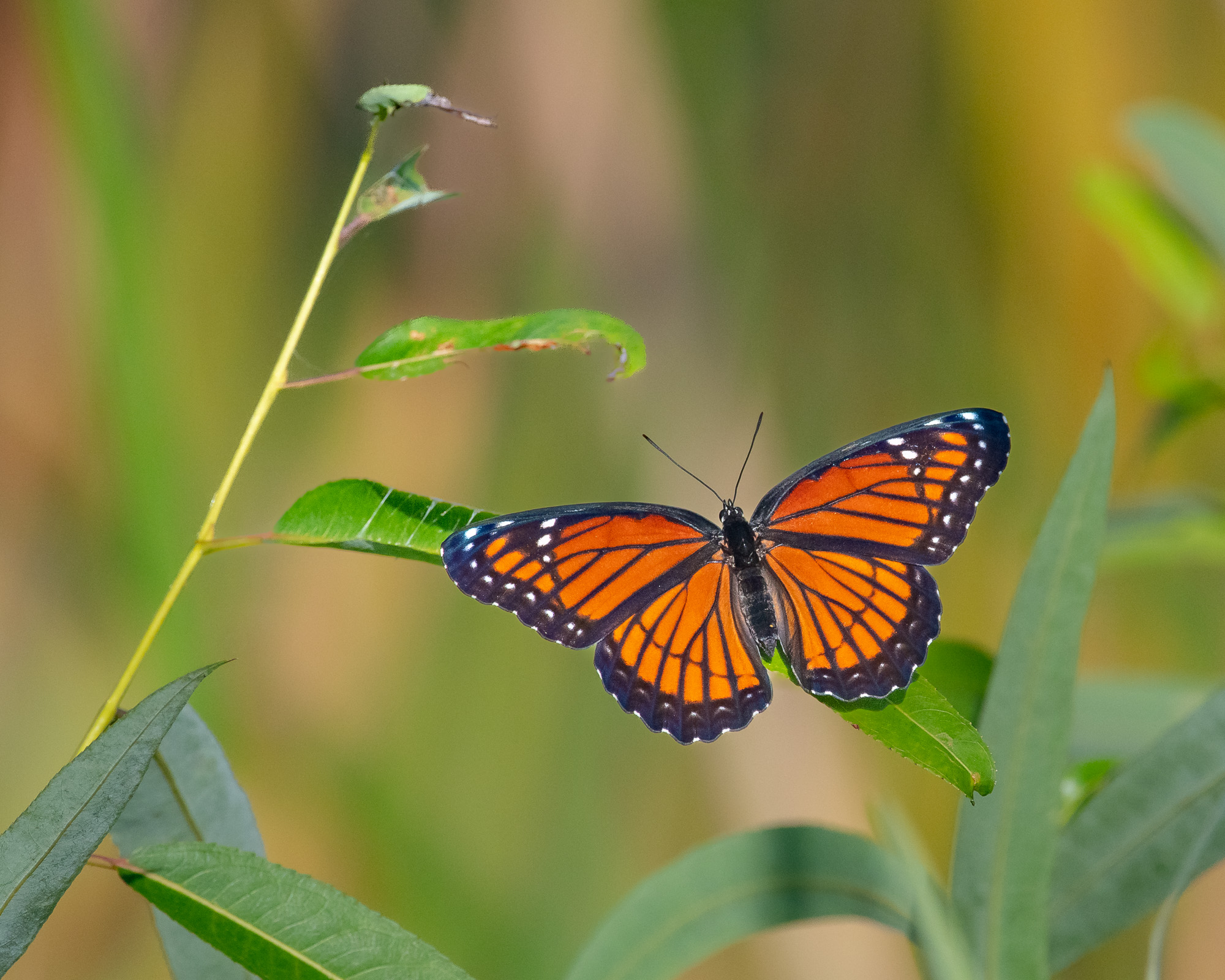 Although they are only very distantly related, the Viceroy (Limenitis archippus) is similar in appearance to the Monarch (Danaus plexippus). The scientific community is divided on whether the Viceroy is a Batesian mimic (a butterfly that is palatable, but mimics an unpalatable species to avoid predation) or a Mullerian mimic (a mimicry involving two unpalatable species). We did not taste this one to check for palatability.
