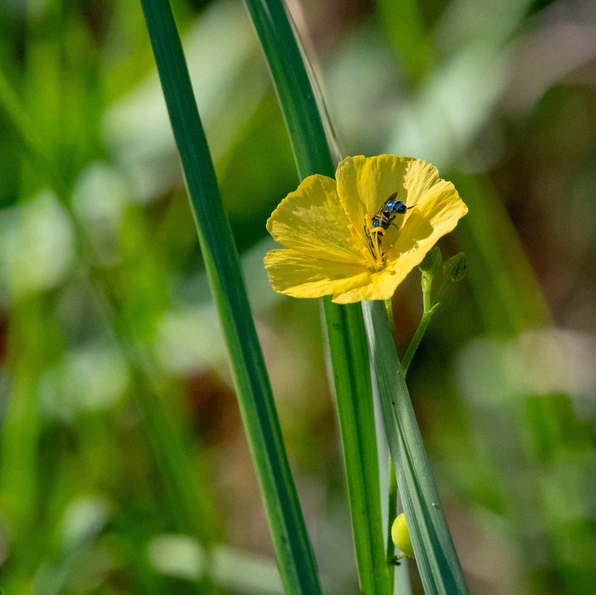 With petals which remind me of paper, the butter-colored Pitted Stripeseed (Piriqueta cistoides subsp. caroliniana) offers sweet nectar for a Brown-winged Striped Sweat Bee (Agapostemon splendens).