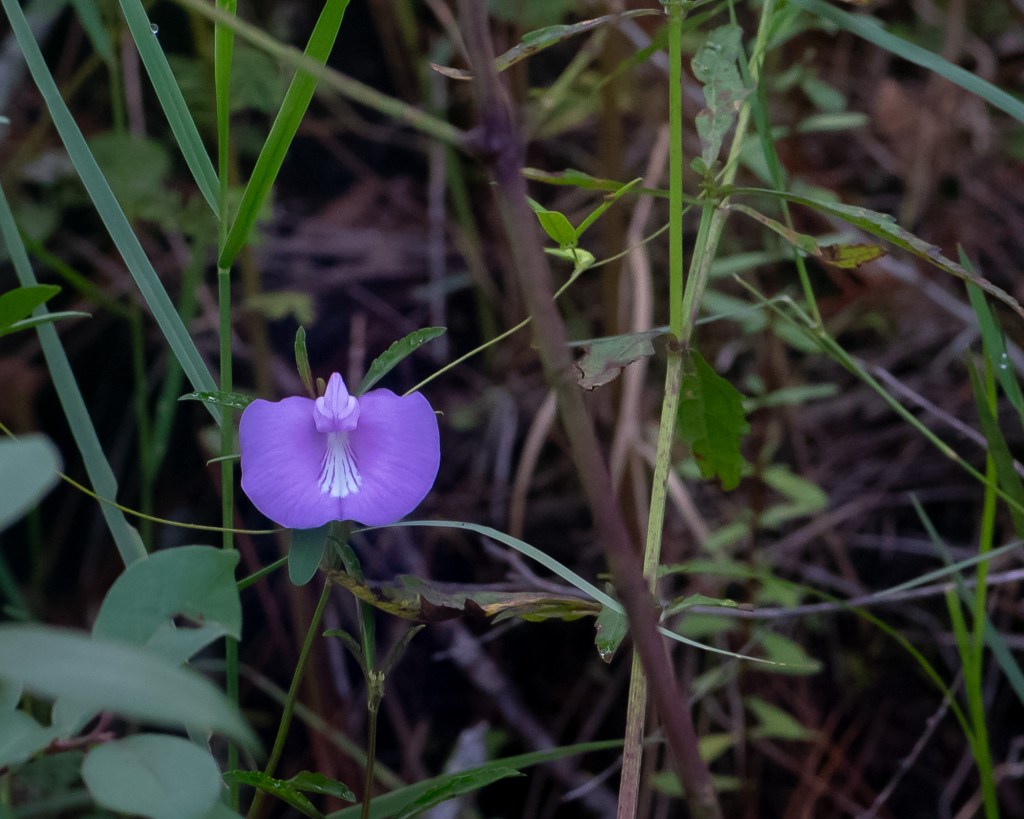 Around the edges of the pine flatwoods, trailing vines of Spurred Butterfly Pea (Centrosema virginianum) show off their lovely lavender flowers. This is a host plant for several species of butterfly.