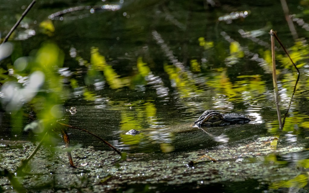 You’re just walking along, enjoying the outdoors and you have that “feeling” someone is watching you. Amazing how these large swamp lizards can blend in as they lay mostly submerged in a small pool. American Alligator.