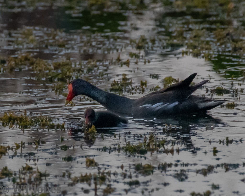 Common Gallinule chicks seem to have hair rather than feathers. Mom is showing junior how to select the best produce.