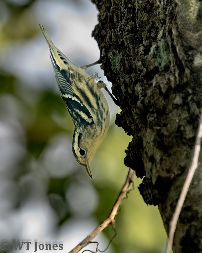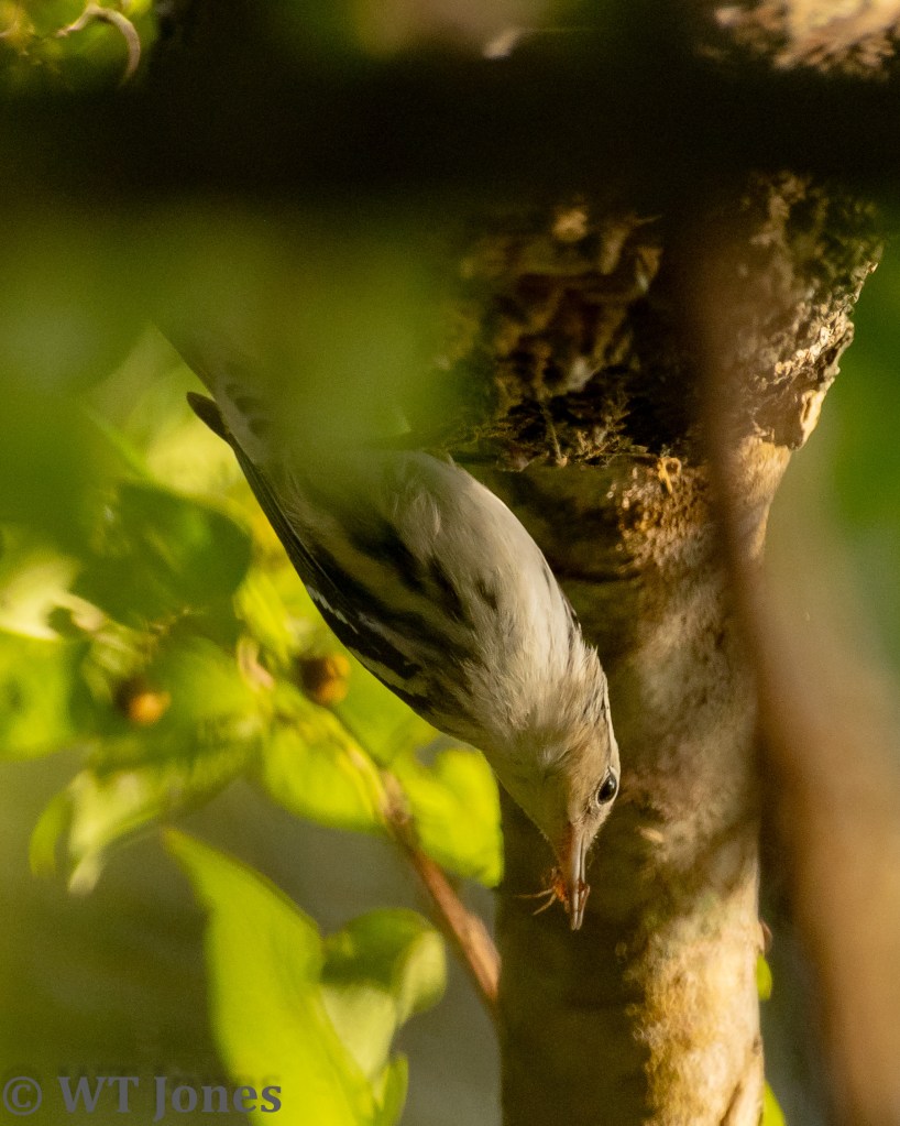 Speaking of breakfast. In the same tree as the Redstart above, a Black-and-White Warbler performed its Nuthatch imitation by running down a tree trunk to wrangle a wriggly spider.