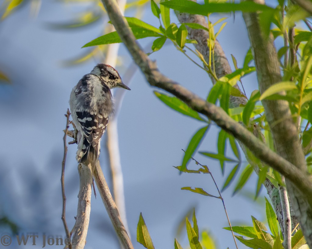 A young male Downy Woodpecker hopes to find his own wriggly morning snack.