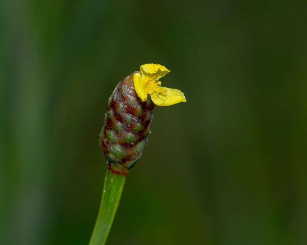 Yellow-eyed Grass (Xyris spp.). There are over two dozen species of Yellow-eyed Grass in Florida. This is one of them. This speciemen was about three feet tall and we encountered a lot of it along the path, although none was in full bloom. The small flowers appear very delicate.