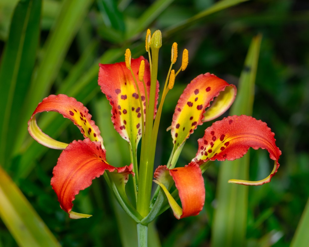 Pine Lily (Lilium catesbaei). Also known as Catesby’s Lily, is named for the British naturalist, Mark Catesby, who explored the flora and fauna of America in the early 1700’s. Found throughout the coastal plain states of the southeast, it produces the largest flowers of any member of the lily family. Growing to a height of 2-3 feet, it loves moist pine flatwoods and nearby prairies. Within Florida, it is a threatened species, due primarily to loss of habitat.