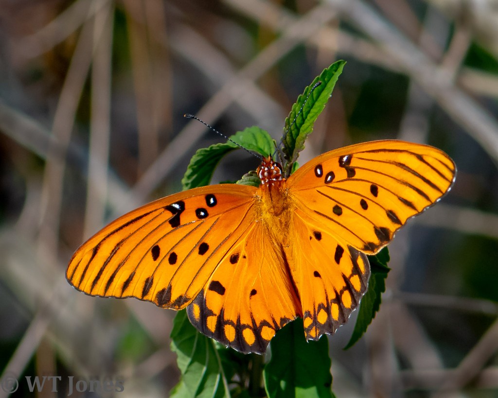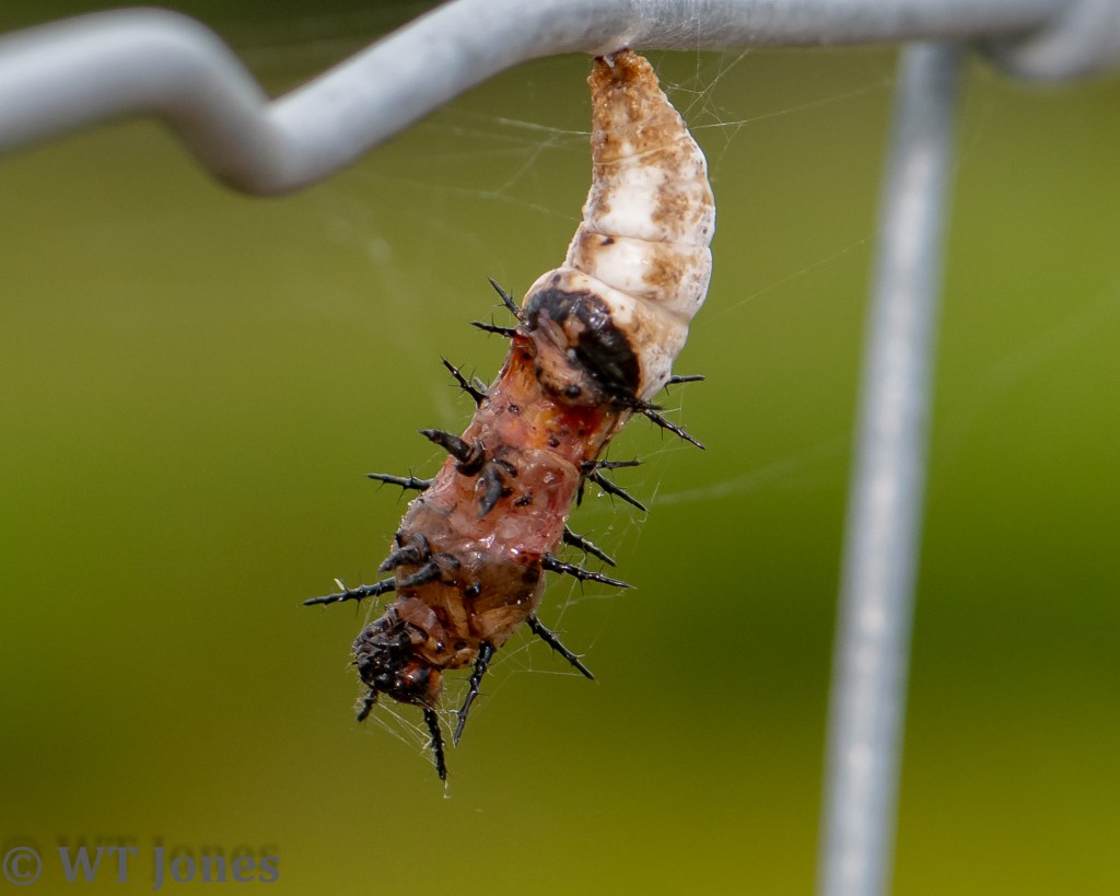 We discovered the larva of a Gulf Fritillary (Agraulis vanillae) butterfly working to create a chrysalis. It will remain in the protective case for 10-14 days before emerging as an adult. (The images of the adults are from earlier this year and are provided for reference.)