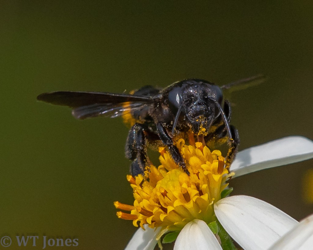 We were fascinated to watch this Carpenter-mimic Leafcutter Bee (Megachile xylocopoides) gather nectar from the small blooms of Spanish Needles/Beggarticks (Bidens alba). This species has no “pouches” on its legs for pollen like some bees, but the pollen sticks to its abdomen.