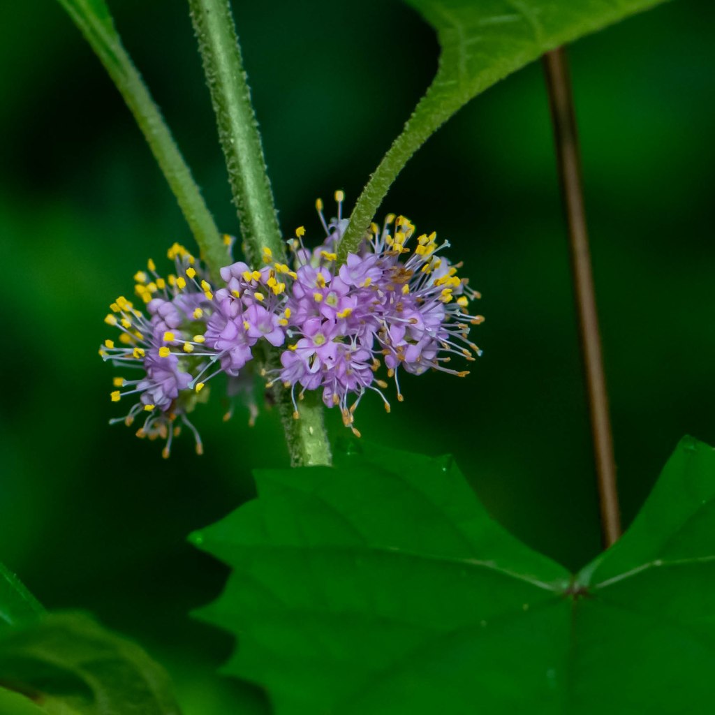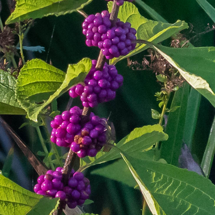 Very common throughout the state, American Beautyberry (Callicarpa americana) has small but lovely flowers, luscious-looking berries, rich green foliage, pretty stems and, according to some, has many useful properties. Parts of the plant have been reported to be good to eat, may have medicinal qualities, berries have been used to dye cloth as well as used in preserves. (Don’t consume anything unless you are 100% certain it is safe!)