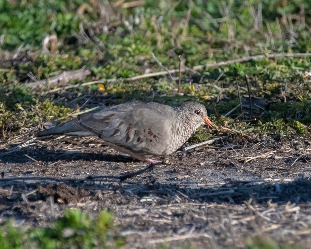 Watching Common Ground Dove feed gives one the impression they almost have no feet. Gini says they remind her of small wheeled toy birds we gave the kids. Smaller than their Mourning Dove cousins, the plumage is quite handsome.