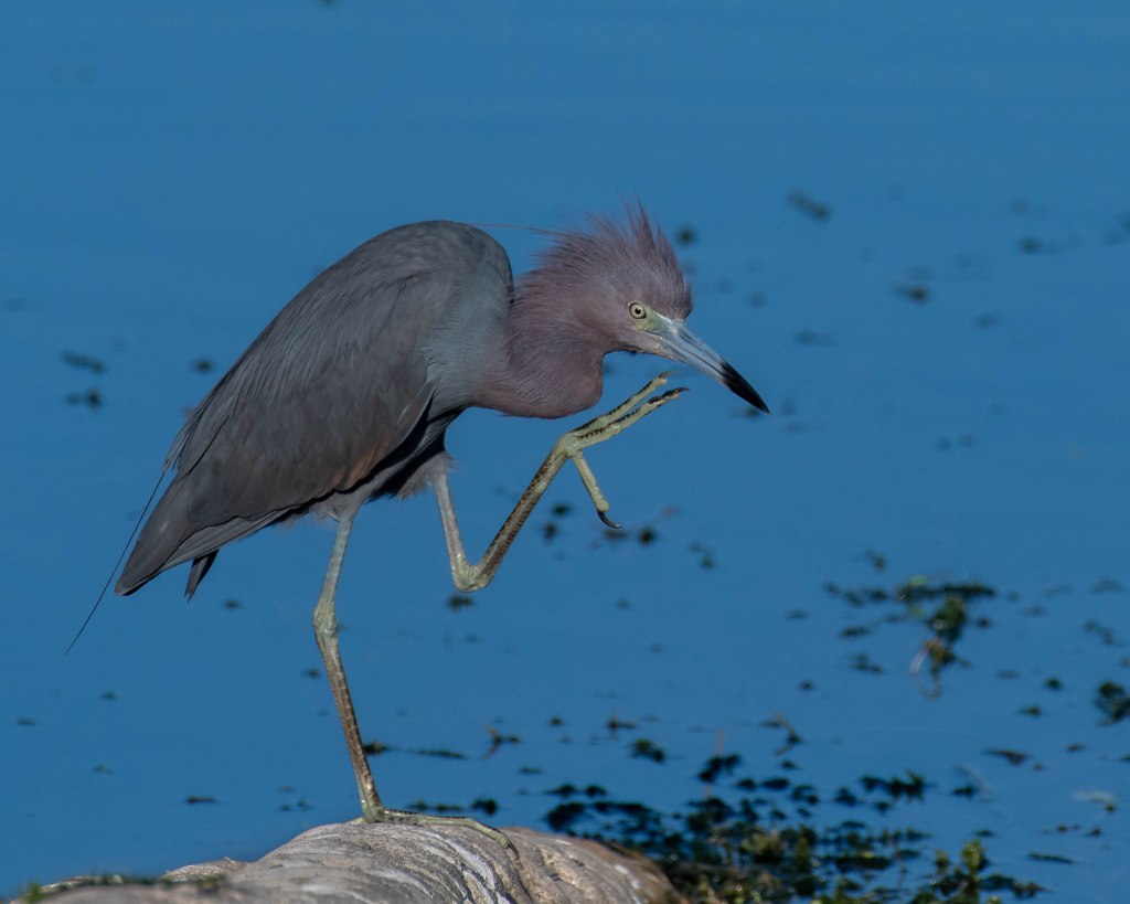 A boat ramp can be a good place to fish. Just ask this Little Blue Heron. As soon as he scratches that itch.